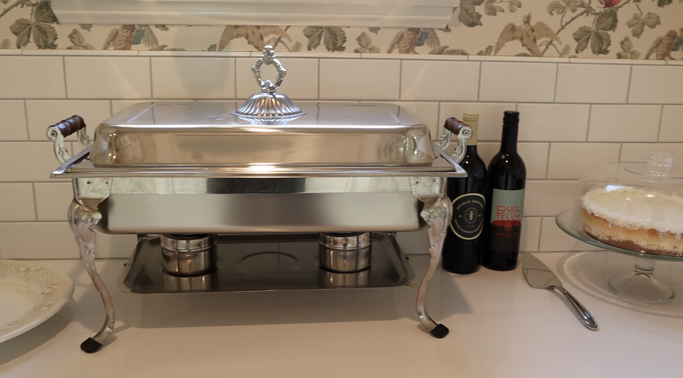 I finally purchased some elegant chafing dishes. I’ve wanted these for a while. It’s much more convenient to keep the food warm this way, rather than in the oven. On the menu tonight is Mediterranean food… one of my favorites. We are having chicken and vegetable kabobs with basmati rice and a Mediterranean salad. Appetizers are falafel, hummus, pita bread, and tzatziki. And, the pièce de résistance is cheesecake with raspberries for dessert.