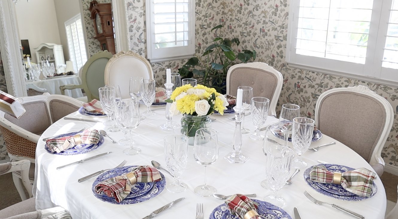 Time to set the table. There will be 8 adults and 11 kids at the party tonight. That’s a lot of people! Because I’m in a very busy season right now and feel a little stressed, I thought I’d make this dinner party as low stress as possible and will order the food in. There’s no shame in that game. People will often not entertain because they can’t do it a certain way… I say the most important thing about the gathering is that you, in fact, gather and connect. It doesn’t matter if you haven’t cooked a meal from scratch. People just like being invited over. Don’t worry about judgement. Sometimes I’m able to cook for everyone, but tonight, with 19 people being here… I outsourced the cooking. But we will get to that later. I’ve decided on Spode Blue Italian for tonight’s dinner as I have enough of that collection for the amount of guests I’m having. I have matched it with my fall plaid napkins and gold rings. We didn’t have enough chairs, so we brought two down from other rooms that are in a similar style. It may seem strange, but I get a definite thrill from setting the table. Why does this bring me so much joy? It’s the little things in life. It’s an artistic pastime for me. I love selecting the plates, napkins, tablecloth, flower arrangements and how they will all go together. Of course, candles are a must. I always think of Hyacinth Bucket and her candlelight suppers! Ha!