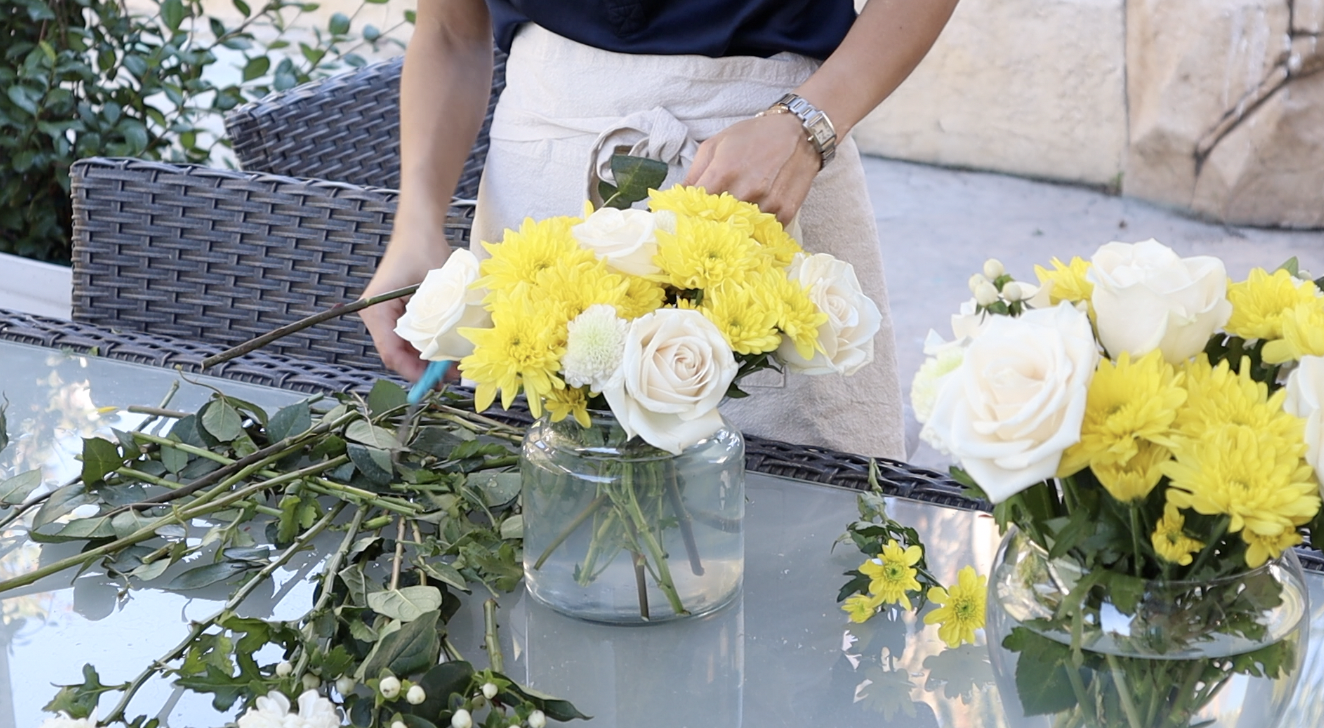 I usually find my flowers at Trader Joe’s because they are very affordable and have a good selection there. Since we are still in fall, I wanted to bring some creams and yellows into these bouquets before I begin moving into the deep reds of winter. I decided on a special mix of cream roses, white mums, St. John’s wort, and chrysanthemums. I’m making two versions of the same bouquet for the kitchen table, where the kids will eat, and the dining room table, where the adults will be. It takes me a few tries to get the stems the right length, but I am loving this combination. I take some of the leaves off the stems but not all. I find that if I change the water every day, I can get my bouquets to last more than a week this way.