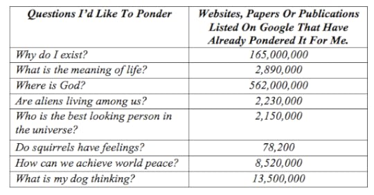 My point is, I no longer need to ponder the meaning of existence—I can simply Google it. Don’t believe me? Look at these results: