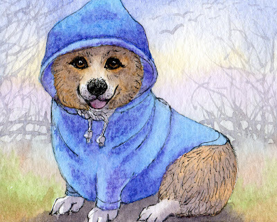 Paddington Corgi; Tuxedo cat in garden; Hound Hoodie in blue