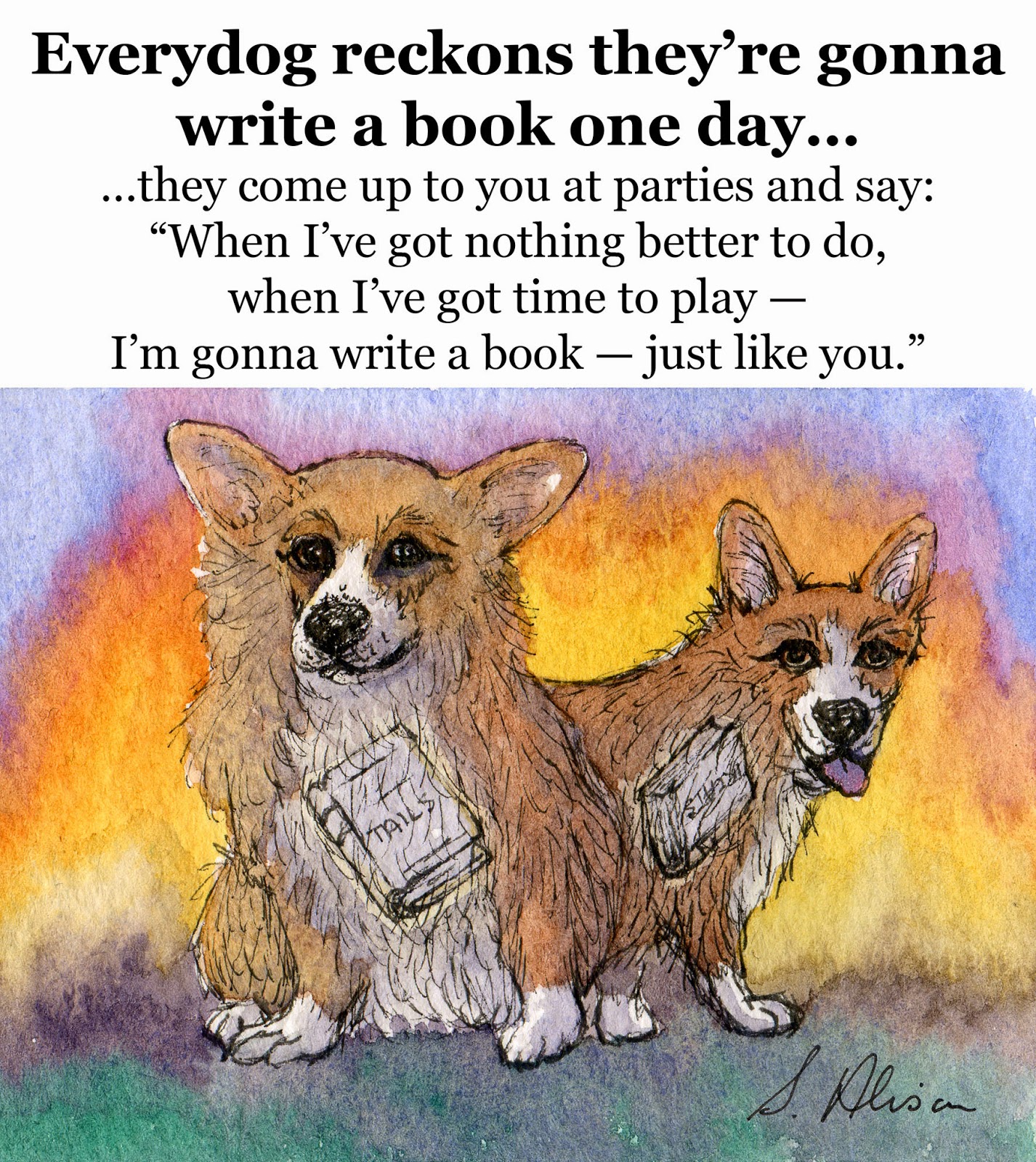 Excerpt from 'Woofs of Wisdom on Writing' by CorgiScribe; illustrated by Susan Alison