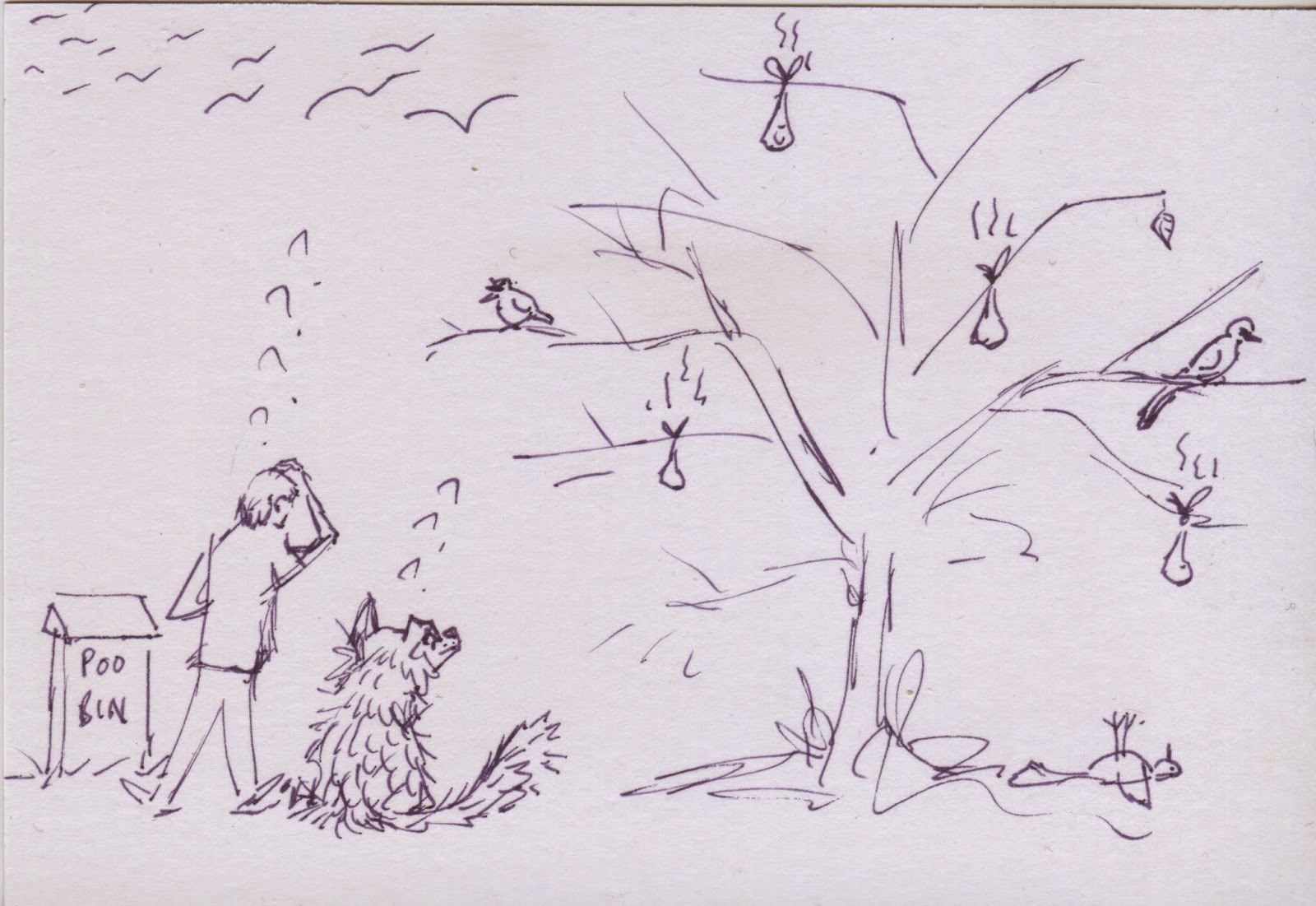 Yeah. So today. We're ambling along, when we're approached by a man who says: "You've got a dog, so what I want to know is this - why do you dog-people pick up your dog-poo, tie it up into little black bags - and then..." (Jeff-Dog and I, we're already holding our breath at this stage) "...and then why do you have to tie the bags into the trees?"