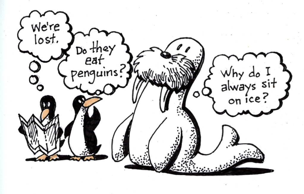 My daughter had a friend over, and they decided to do some drawings. Her friend asked me how to draw penguins, and this came out. I felt like drawing a walrus, but I know, from researching for my Lunch Note Project, that penguins don't live where walruses (walrusi?) do. So I decided to make my penguins very, very lost.Also, I realized that people always draw walruses sitting on ice. I figured it was about time one of them questioned the wisdom of it, as opposed to sitting on, say, a couch.