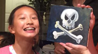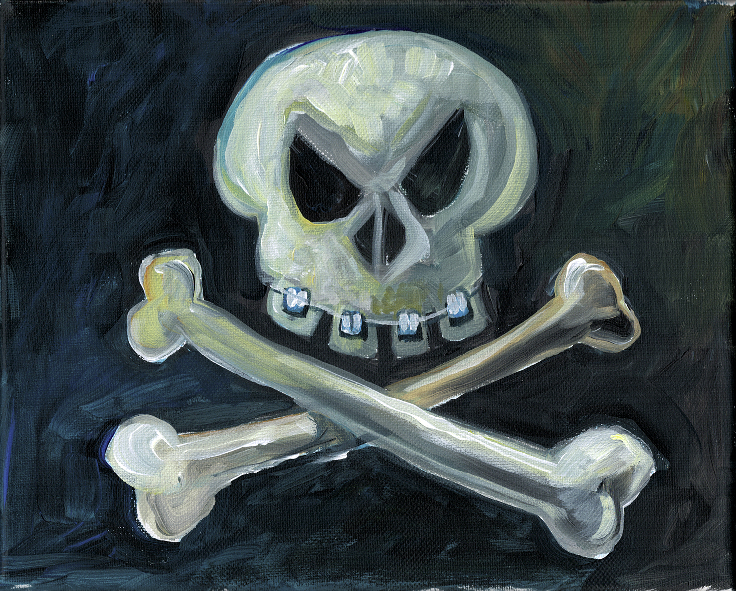 This came about during a semi-private painting class I was teaching. One of the kids had two bits of news - one, that she got braces, and two, that she and her family were going on a cruise to the Caribbean. I commented that she was going to go sailing like a pirate, when her friend said "Pirates don't wear braces." I called Nonsense! and said that all you'd have to do is add braces to the skull on the Jolly Roger.