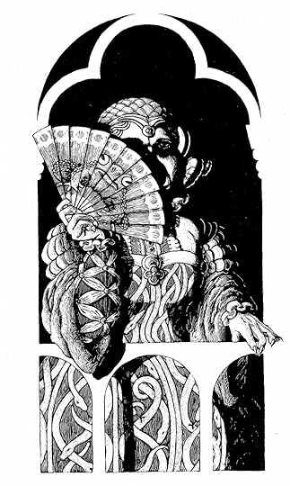 The illustration comes from an older version of Sleeping Beauty, by Charles Perrault. In most current versions, it's all happily-ever-after once the Prince kisses her. In Perrault, once she wakes up her troubles are only beginning. The Prince's stepmother is an ogre, who wants to eat her own step-grandchildren, along with Sleeping Beauty as well! And, were it not for the kindness of the cook, she would have succeeded. Then the ogre tries to kill them all with snakes and poison toads… but why give away the ending?