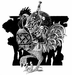 I always like "Hans My Hedgehog" ever since I read it in Grimm's Fairy Tales, mainly because it's so surreal. He's a half-human, half-hedgehog who's parents want him to leave. He agrees, but only if they shoe his rooster and give him bagpipes. Only after I started drawing it did I realize what an unfortunate instrument a bagpipe is for an animal with sharp spines!