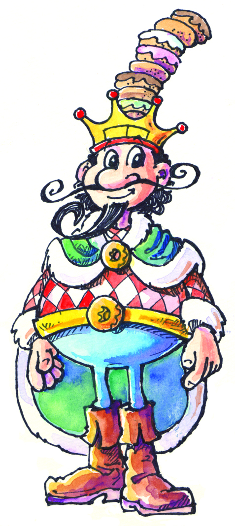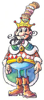 Yet again, it was time for the kids' Christmas book! Was initially planning the pirate story, but wanted to get back to some watercoloring roots after all the computer art I'd been doing lately. So I did The Donut King instead.Here's the man himself, looking all round. His title isn't a misnomer. I'll put up more pictures in future posts.
