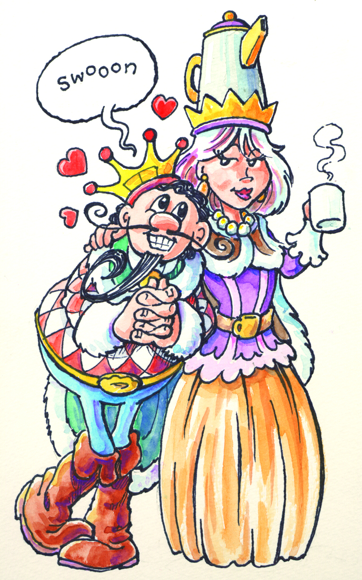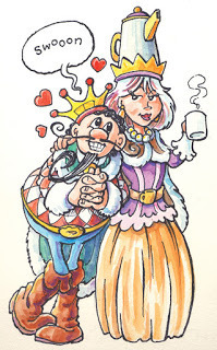 I based her on my wife, which may be one reason why the kids think that I'm the Donut King. This is pretty much how I react to her. Initially I was just going to do a drawing of the Queen's portrait, but thoughts of my wife inspired me to draw it the way I really feel.