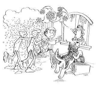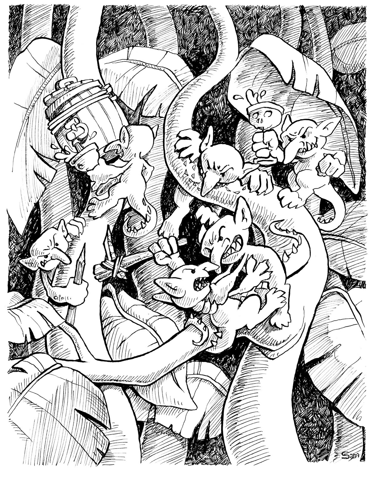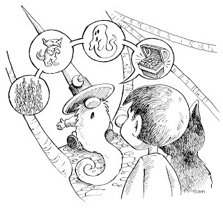 The overgrown forest contains goblins, ghosts, and... treasure! So says the legend. When I first decided to make all the prompts into one long story, I just went where the words took me. But as I've been drawing this story, I realized something that hadn't originally occurred to me. The monsters show up just as the wizard was CONVENIENTLY flying by to save him? The more I think about it, it seems like the wizard is responsible for the monsters just so he could save the guy and have a lackey on his treasure-hunting expedition. Be careful when dealing with wizards. Wizards have plans. #inktober2019 #inktober #samvalentinoinktober2019