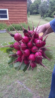 My daughter-in-law, Natasha called this a bouquet of radishes. Not to brag too much, but these are the best radishes we’ve grown in our Roshara garden in many a year. Usually they are tiny little globes filled with worms and impossible to eat. Not this year.