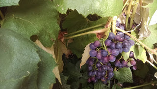 Then there was last year. Never had I seen since lush growth. The vine not only grew to the end of the split rail fence and headed south, but when it reached the corner post it turned and began growing west (with my help). I looked forward to the best crop of grapes ever. But alas, when I began harvesting I found five grapes. Not five quarts, not five pails, but five miserable little grapes. A late frost last spring had taken its toll.