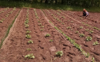 By early afternoon we had planted six long rows of white potatoes and one long row of red potatoes, a row and half of red and yellow onions, a row of peas, and long row of what Natasha called our “salad row.” Here she planted several kinds of lettuce, spinach, kale, Swiss chard, radishes and carrots.