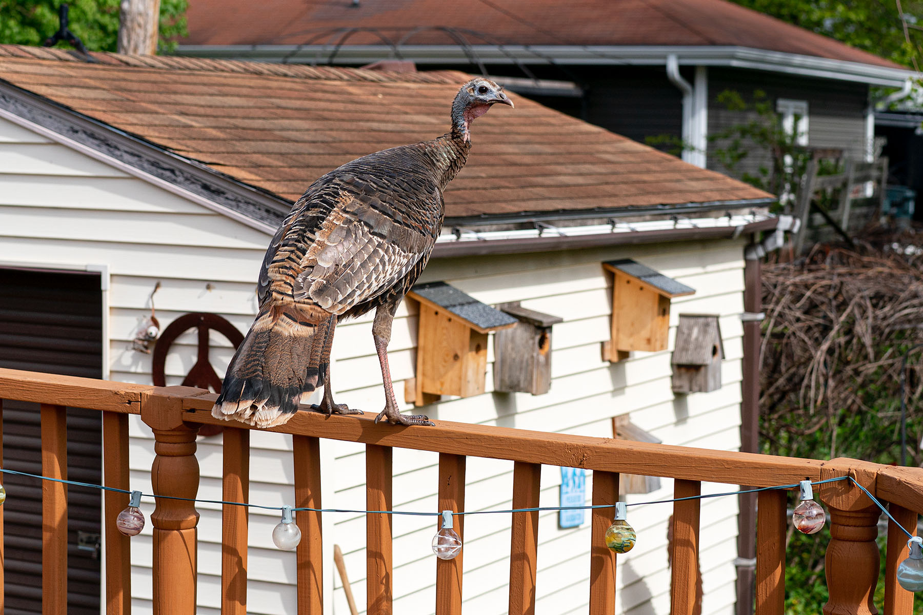 Steve, a professional photographer, snapped the above photo when the turkey, not too sure about Steve’s little dog, hopped up on the deck’s railing. When the dog began barking, the turkey flew to the neighbors.