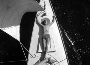 The image at left, from Roman Polanski's film Knife in the Water, is perfectly poised between geometry and iconography. The Jesus figure is a hitchhiker picked up by a married couple on their way to a sailing excursion on their boat. Polanski's early film is as taut and carefully composed as this shot. The camera works around severe constraints as almost all of the action takes place on a moving sailboat, at close quarters. But the screenplay reinforces this compression. There are only three characters in a slow-moving drama that allows each pair in the trio its own moment of conflict and release. The hitchhiker is the hinge. He is the new element in the couple's ritualized lives and he (temporarily?) breaks them out of their routines. Polanski plays with the suspense, as the actors circle each other warily and the knife of the title appears over and over again without resolution. It will, in fact, play a major role in the denouement, but not as one would expect. In respecting the classical unities of time, place, and action, Polanski created a beautifully-balanced three act play. Translated to black and white film, Knife in the Water is also a study in visual storytelling, with little dialogue or exposition. This image is self-consciously composed to highlight its religious allusions: the pointed arch, the mid-range view from on high, and the dramatic symmetry. It positions the nameless hitchhiker as a sacrifice, but the story becomes more complicated than that. The conventionally asymmetrical situation — two men, one woman– cannot be easily resolved. The final shot leaves us literally at a crossroads, in the same kind of paralyzed limbo as the man in this image.