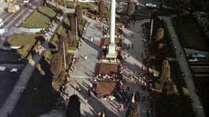 Today in class we looked at the opening credit sequence of Francis Ford Coppola's The Conversation (1974). It's a masterful long, slow, single shot descending from above to zoom in on Union Square Park in San Francisco. We instantly feel disoriented — where are we positioned? who are we supposed to look at? The audio track, which indiscriminately picks up all the ambient noise in the plaza — from street musicians to the garbled conversation of the title, underscores this confusion and cacophony. The needle-like pillar divides the frame in symmetrical halves, one in the light and one in shadow, and there is an immediate sense of moral stakes. Something is not right, but we don't yet know what.
