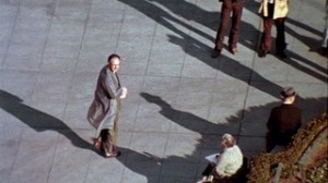 Deliberately, the camera begins to follow people as it closes in. We watch a mime working the crowd. Then he hands off the focus to a man in a raincoat (Gene Hackman), whom we follow next. Then, there's the first cut and we see a sniper on a rooftop, surveilling the scene. The layers of voyeurism become complicated. We were the watchers, but now watching is suspicious and threatening. The man in the raincoat seems to be our target, but he seems to be following someone too. In the first few minutes the film has set up a visual idea and left us without a stable perspective. We will later discover that our man in the raincoat is just as disoriented as we are, that he too is not sure of what is going on and struggling to see and hear clearly. This economical opening encapsulates the whole.