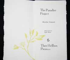 The Paradise Project is being hand-published by Hugh Barclay, book artist and owner of Thee Hellbox Press. “I’m working on the last signature and I hope to put the press to bed on July 15th, providing that the stars and the moon are properly aligned.”