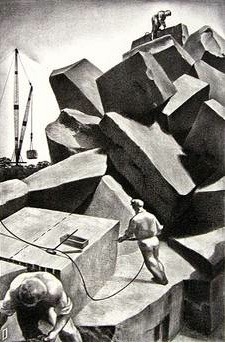 And protect them by dropping them into the pond.Construction image: Granite for monuments (for future monuments), 1939. Lithograph by Louis Lozowick .