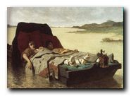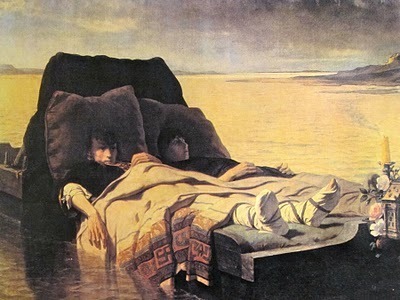 The other image is one I haven't been able to identify. (If you can identify it, I'd be eternally grateful!) It's of two people, possibly a man and a woman, floating on a platform on a lake, half-emmersed in water. This image captures, for me, the feeling of the creative process, of immersion in unconscious.
