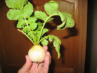 White RadishI never have liked radishes. We had them only on special occasions when I grew up in Phoenix. Thanksgiving and Christmas dinners always included a relish tray and those little, ugly tasting red radishes were between the celery and the pickles. Their red color faded and they looked dry by the end of the day. I often wondered if anyone really liked radishes. Lance planted them, and I yawned. Whatever. But when they came up red, purple, pink and white, I had to taste them. Hot, spicy and crisp - have to have them in every salad I make now.