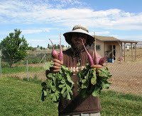Lance with new crop of radishesI'm so excited about the garden today. We're seeing even more vegetables make it to our table and promises of more to come. The size of the radishes are phenomenal with our second growth that we were able to keep relatively bug free. You wouldn't think bugs eating the green part above the ground would have that much impact on the root below ground. But wow did it.