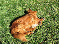 Rusty enjoys a roll in the grassNext year, we have a better plan that should eliminate a good part of our weed problem. All those lovely rows make for a beautiful home for weeds down in the troughs where we flood. A few vegetables, like potatoes and onions, may still need mounds but the rest can grow on flat ground. Then we buy these flat hose things with little holes that lie on each side of the plants and water the plants directly. They aren't very expensive but we'll have to wait until next planting season for that investment. Quite frankly, I can't do another year of this kind of weeding.