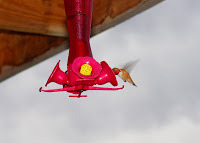 We have hummingbirds. I thought they were skittish, sweet birds until we hung three feeders. They are not social creatures and fight amongst themselves all the time. We have one bully who tries to run off the others even when not feeding. They are fearless of us. In fact, one dive bombed Frank. But we do get entertainment watching them.One more animal story - Xena (our toad licking female) likes strawberries. I planted two plants in the area out front of the house just because the plants are cheap and attractive. One plant puts out one berry at a time and Xena always beats me to picking it when it ripens. I wouldn't know this except we caught her the first time. Now I watch and try to get it just as it ripens but that naughty girl beats me every time.