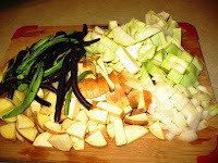 Veggie stir fry coming up!Okay, to end on a positive note, our food budget has decreased noticeably. Some is due to figuring out ways to make less expensive nutritious meals. Some is due to our food swap with the neighbors that have chickens and other veggies, but a big part is the garden. We don't buy eggs and buy next to no vegetables now. Before dinner, I jaunt out to the garden with my basket and collect what we need. Last night, I came back quite sweaty and complained that someone needs to get air conditioning in the produce section!
