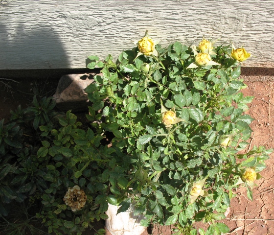 Miniature rose bushI needed that because I found another spot on my arm. This kind of bloom I can do without. The good thing is I was 99% sure it wasn't melanoma again. I called the Indian Medical Center and they moved my already scheduled appointment up a week. My doctor even called me back. Every three months I have a full body check. He took a biopsy and scheduled me to come back in two weeks for the result and my full body check. I wondered, if this spot had been very suspicious would it still have taken two weeks for the results. I hope not. But the news was good - only pre-cancerous. Nothing more had to be done. I like this doctor. He's very personable but awfully shy for a doctor.Not a good thing. His full body checks skim over certain areas. He's obviously uncomfortable. But really? I've never met a doctor with this problem. I'm a little concerned about that.