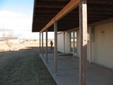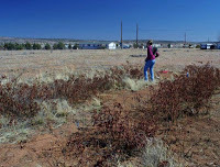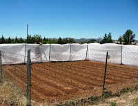 Lance struggling with making a windbreakerThe pepper plants love the heat but not the wind. The directions say plant in a warm, sunny place out of the wind. Hahahaha. In Paulden? But we WANT peppers - all kinds. So we constructed a wind barrier around them while the wind was blowing at over twenty miles an hour. We didn't have time to get into Prescott or the money to buy anything special, so we used the row cover cloth. Our barrier lasted for a few hours. Lance and Christie had left when the wind picked up speed and began tearing through the cloth. Frank and I struggled to repair and add reinforcement. The wind here is so wicked. The house behind us got caught in a whirlwind and their stuff flew through the air