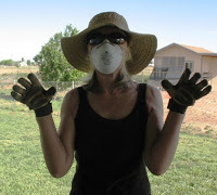 Sadi in the cucumbersGrasshoppers this year are in locust biblical proportions. I exaggerate only slightly. Lance has tried every natural/organic way possible to get rid of them but they thrive. Although we've been much more successful this year at keeping the weeds down in the garden, a few other areas have gone ignored. Weeds harbor grasshoppers as well as other unwanted bugs so I went on the warpath. All good sized weeds met their end. The potatoes are the most bothered.