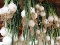 A rainbow of carrotsfrom the soil. I some times have to dig. I've been known to break them down in the dirt. We have red, yellow and orange carrots. Wonder why we only see orange in the grocery store.Onions are kind of fun to harvest. They come up easy and in all sizes. We have three varieties. Not too fond of tying and hanging but love