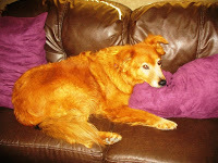 Rusty taking it easy.In the midst of harvest, Rusty had an emergency operation to remove his spleen. If we hadn't gotten him to the vet when we did, he would've bled out within the hour. Good news is he's recovering nicely from the operation. Bad news is the lab on the spleen came back as cancer, the most aggressive kind. They didn't see any other tumors or indications when they had him open, but chances are pretty high that it could already have spread. We're going with the low chance of survival. Christie and Frank did research on cancer in dogs and came up with a diet to ward off the evil condition. Rusty is loving his new diet: