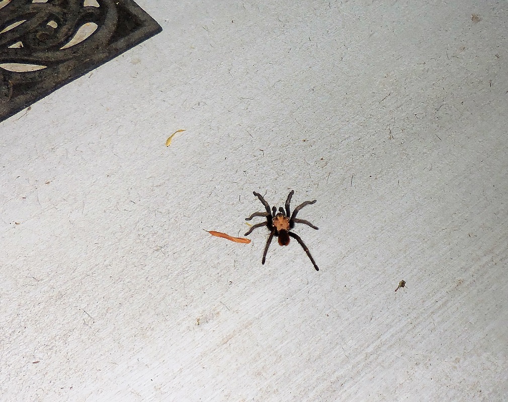 Tarantula by my doorthem here, but they aren't roaming around in the open too often. They're good spiders, and not harmful to humans. They still creep me out.
