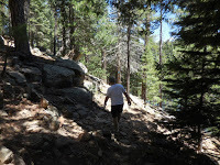 FDW walking down to the lakesorry to say the only wildlife we ran into was two hawks, a squirrel that looked like a hairy lizard, and a bird. The last half of the forty-four-mile trip was rough road because of all the rain they’ve had up on the rim. We had to slow to a crawl to get over and around boulders. And in order to keep your spirits up, the mileage markers were a joke. At one point, we saw a sign for twenty-two miles to the main highway. We drove five miles and the next sign said twenty-two miles to the main highway. Eventually, we came to a sign that said eleven miles. We drove four miles and a sign posted eleven miles to the highway. We drove six miles and the mileage sign stated twelve miles to the highway. FDW figured we’d entered The Twilight Zone. I started singing “And the road goes on forever, and the party never ends.”