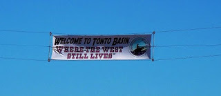 Sign over the road coming into townWe're living life on the RV Ranch these days. If you're from the western United States, you might have a feel for a little town, that's not a town, like Tonto Basin. There are two gas stations, an IGA Market, a Dollar Store, and numerous RV parks. And don't forget the local hardware store with local color. One day, I complained to the counter guy that it was really hot. He said, "my granny used to say if you wake up and there ain't sweat tricklin' between your butt cheeks, then you're dead."Up the road is Punkin' Center with a post office, school, and library. Down the road is Roosevelt Lake.I dislike the desert...well, most deserts. This part of Arizona is what I call pretty desert because we have mountains and trees. It's also only a thirty