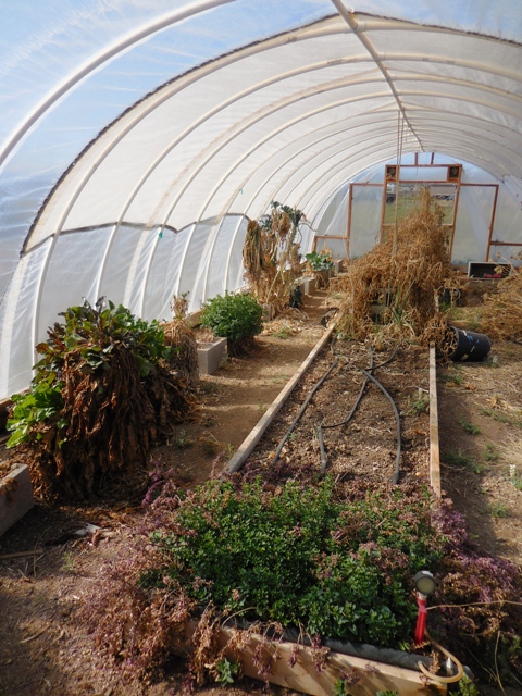 The greenhouse needs loveSide note: The greenhouse was closed up and neglected this past year. When we opened the door we found a couple of herbs, kale, and chard still living!