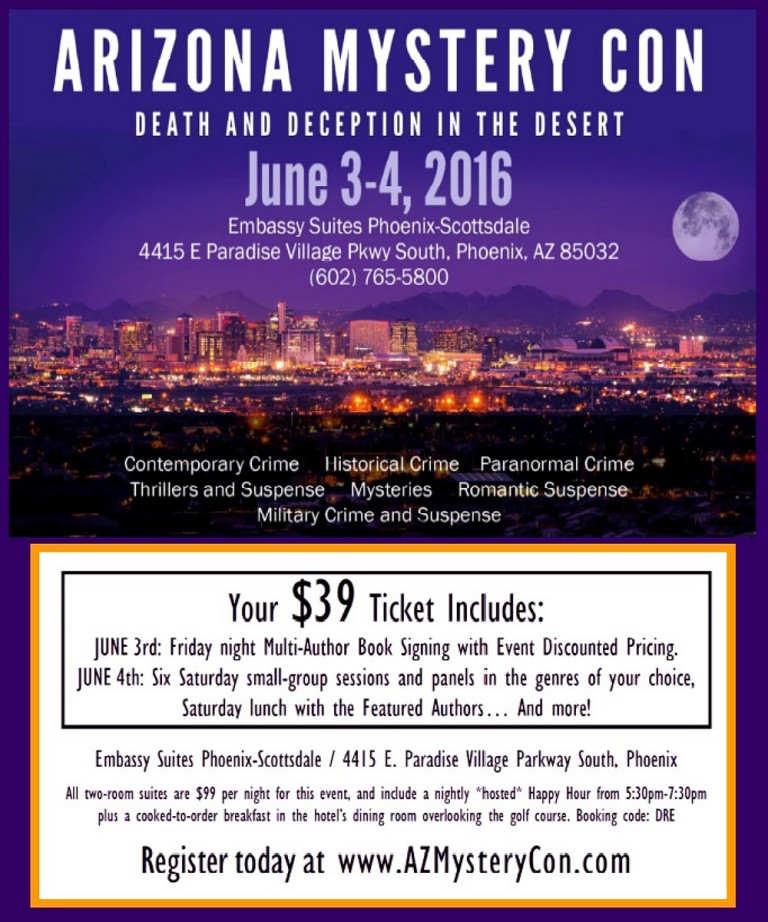 Only about six weeks until Arizona's first ever Mystery Con. This is the premier event for fans of Contemporary, Historical, and Paranormal Crime fiction, Thrillers and Suspense, Mysteries, Military Crime, and Romantic Suspense. This is your chance to meet authors in an informal and casual atmosphere as well as purchase signed copies of their novels. It's going to be a lot of fun!Many of the authors are giving away prizes, offering some fun events, and discounts.