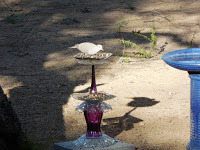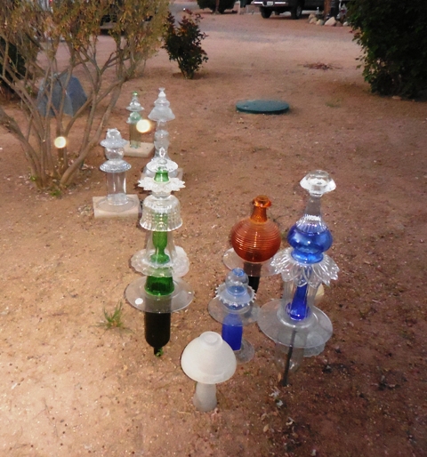 More in the rose gardenthat is really upscale. There are three lovely wood cabins around a little courtyard. One cabin is two stories and filled with house wares, including furniture. They have it laid out beautifully. I think if I were to set up house from scratch, I’d hit the used stores first.There are a few ladies in the RV Park that have gotten into glass art. Big Time. They’ve collected so much used glass, they could open their own glass shop. They make frequent trips to yard sales and stores like Goodwill. They make beautiful yard art—everything from angels to birdbaths to pieces of decoration.