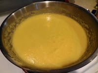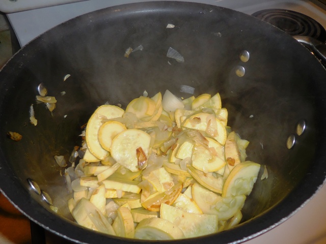 Yellow crookneck cooking with onions.I like yellow squash steamed and drizzled with butter, but there's too much to keep up with so I made soup:I sauteed sliced squash and onions (also from the garden) in olive oil