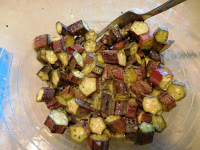 Okra in eggMy two favorite vegetables in the garden this year are yellow crookneck squash and purple okra. Purple Okra is not a heavy producer so I'm not challenged with trying to freeze or can. I just cook