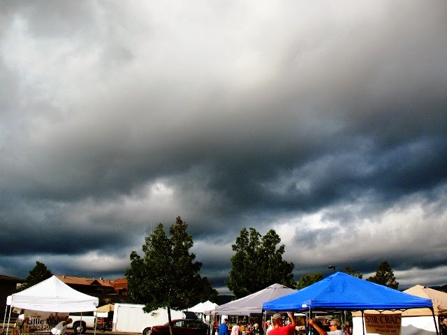 Saturday skiesLast Saturday, the farmers' market was windy and it rained. First the wind came and repositioned our tent three feet over, in spite of forty pound weights on each leg. That didn't really drive off the shoppers, but the buckets of water that came moments later pretty much dampened the mood.