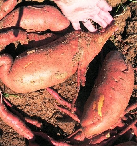 Good sized sweet potatoesto cold weather. Happily, no freeze damage this year. They're now in their two week cure period which means spread out in the garage, kept warm and dry. Then they'll be wrapped individually in paper and packed in boxes for storage.