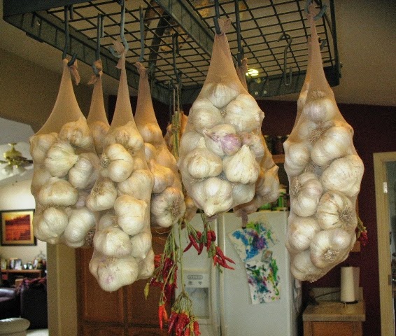 Garlic in nylonsFound a better use for nylons than wearing -- they make great bags for storing and hanging garlic. Dollar Store (the Paulden Mall) had boxes of ten for cheap.