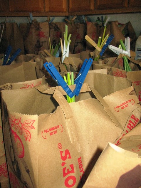Bags and bags of drying dill seedsdays the kohlrabi can be harvested. And carrots can be dug up whenever we need them. The last of the dill seeds have been harvested out of the greenhouse and are hanging in bags to dry before going into jars. Lance planted more onions, okra and broccoli in the dill's place. The outside dill is about six inches high so that should be coming ready before we use up the dried weed and seeds we have from the greenhouse crop. They got so huge in the greenhouse that they restricted air flow and held in too much humidity so we had some mold going on. Lance got that under control.