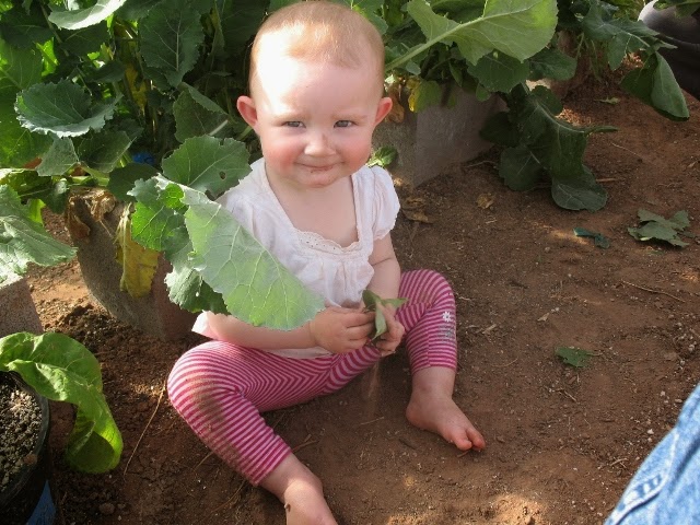 Sadi loves the greenhouse.The wind has been outrageous over the last few days - so strong and cold. Sadi has been antsy to go outside and play. She's been demanding it. So Momma Christie found the solution. She takes her into the greenhouse when she gathers greens and Sadi has a great time. She loves the dirt and can have a snack while she's playing.