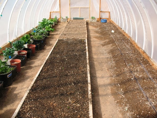 We've been able to get a decent amount of greens all winter from the greenhouse. Greens are still growing but the greenhouse has been readied for the spring planting. Along one side, the greens will continue. Down the middle dill is
