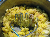 Cut up and boil potatoes until soft. Half mash them. You want some chunks. The mashed ones are what gives the soup it's thickness.