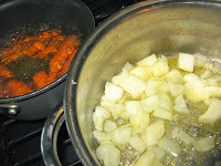 Cook carrots, saute onions.chowder.In a large kettle, spoon in about three tablespoons of butter. Real butter is best. And if you really like butter and richness, add more if you like. Chop and then saute in the butter an onion. I'm assuming it's a big onion. We're down to our small ones so I actually used three onions tonight.